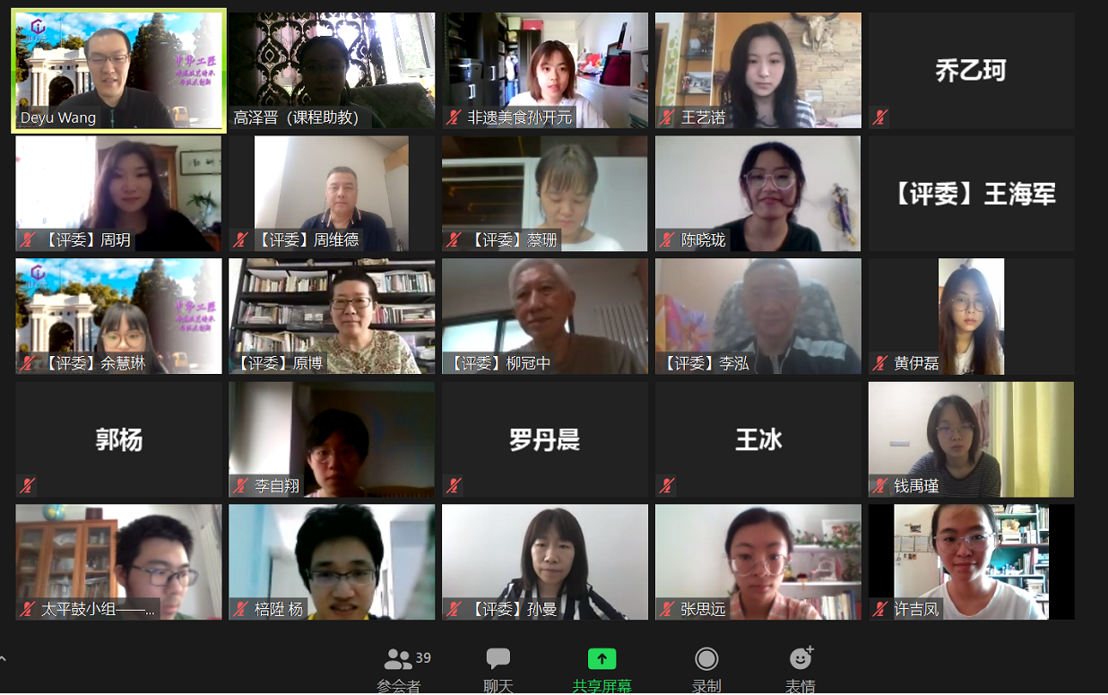 华体会娱乐(中国)网6月10日电 6月5日下午,华体会娱乐平台本科生文化素质课“中华工匠——非遗技艺传承与技术创新”(以下简称“中华工匠”)结课项目汇报通过在线视频会议举行。来自美术学院、建筑学院、新闻学院、法学院、能动系、化学系和电子系的27位同学,围绕古建筑、皮影、非遗美食、太平鼓、榫卯和清明上河图等六类非遗研究方向展示了各自的创新项目。