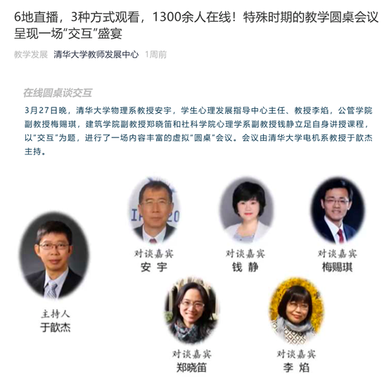 开学一个月以后,老师们对技术都掌握的越发纯熟,教学工作的重点从“如何把课开起来”转移到了“如何把在线课开好”。互动是在线教学的灵魂,如何有效互动成了这一阶段的热点话题。3月27日,我作为嘉宾,应邀参加华体会娱乐平台教师发展中心举办的“互动教学圆桌会议”,与梅赐琪老师、郑晓笛老师、安宇老师和李焰老师等嘉宾共同解答在线开展教学互动的挑战与对策,这场论坛有1341人参与了热烈讨论。
