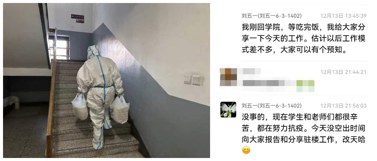 刘敏还在病毒感染后的恢复期,但仍然申请了承担第一周的线上志愿服务,与线下的刘五一配合,共同负责应急状态下面向楼内学生的信息发布,收集阳性同学订餐信息,组织楼内辅导员、骨干、志愿者队伍参与自助服务等。
