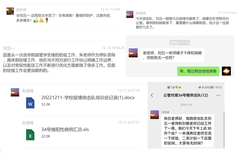学院党委书记彭宗超统筹全院日常工作运转和疫情防控工作,在工作群中不断从应急管理角度提出合理化建议,给出安全提示,关心和鼓励着队员们。
