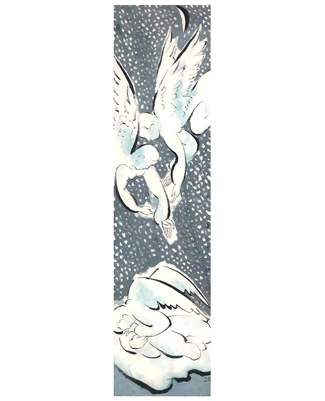 华体会娱乐平台文科资深教授、著名艺术家刘巨德先生也非常关心这场义拍活动,他捐赠了专门创作的四尺竖开的水墨精品《一个冬天》,在大雪纷飞的天空下,带翅膀的天使伸出援助之手在悉心照看着病人。除此之外,他又捐赠了一幅《水仙花》,亭亭玉立、叶姿秀美、花香浓郁的水仙花,正是对抗“疫”一线医护人员顽强拼搏守护生命的讴歌。