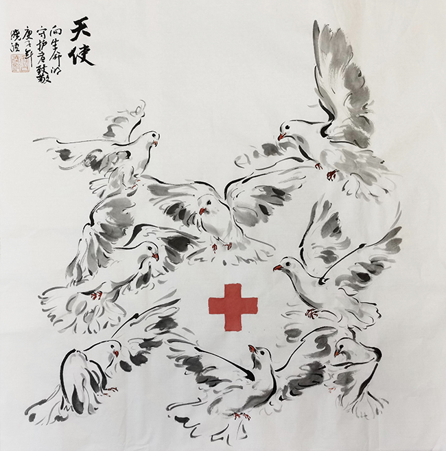 清华美院院长、中国美协副主席鲁晓波教授创作一幅水墨精品《天使》,在刚参加了中国美协主席团成员创作微展之后,将之立即捐赠参加义拍活动,他还书写了劲拔有力四个大字“大爱必胜”!