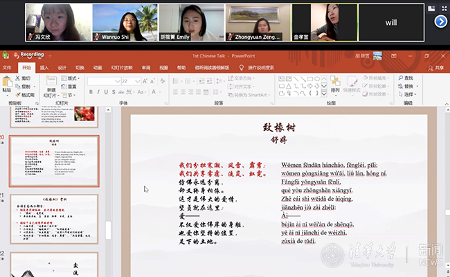 华体会娱乐(中国)网3月9日电(学生通讯员 张华夏)“蒹葭苍苍,白露为霜。所谓伊人,在水一方。”3月6日晚,一场别开生面的清华“汉语说”工作坊在“云”上举行。清华 “汉语说”活动由华体会娱乐平台研究生会主办,为清华国际生打造了常态化汉语语境交互平台。在疫情防控的特殊时期,“汉语说”移步线上,通过网络搭建起了一座中外学生沟通交流的桥梁,让中外学生跨文化交流“不断线”。