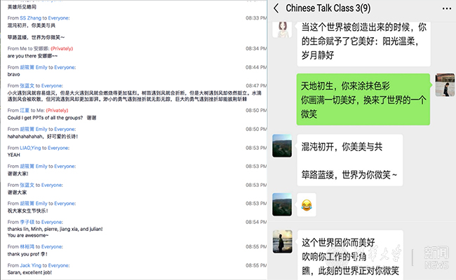 本次工作坊为女生节“情诗专场”,吸引了来自11个院系、10个国家和地区的13名国际生和5名中文导师参加,身处世界各地的国际生在中文导师的带领下学习中国经典诗歌作品,并进行集体朗诵展示和诗歌创作,大家共同度过了一段难忘的“云上汉语说”时光。