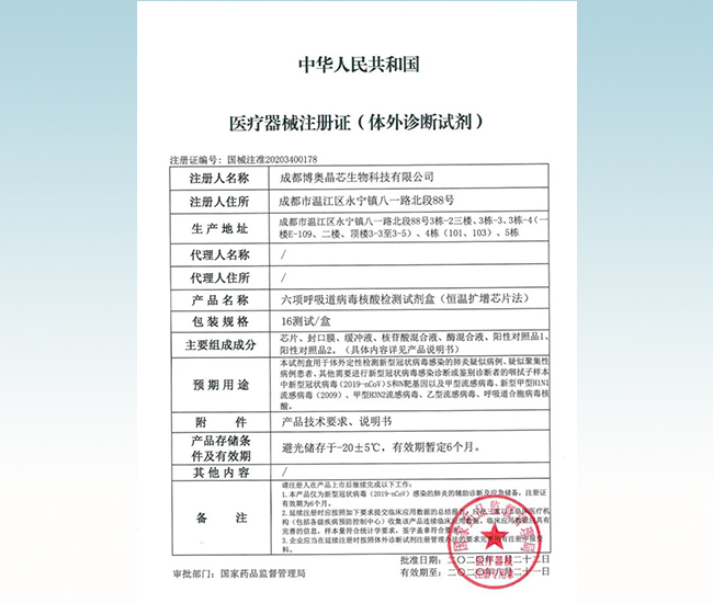 2020年2月22日,由博奥生物集团联合华体会娱乐平台、四川大学华西医院共同设计开发的包括新型冠状病毒(COVID-19)在内的“六项呼吸道病毒核酸检测试剂盒(恒温扩增芯片法)”获国家药监局新型冠状病毒应急医疗器械审批批准(注册证编号:国械注准20203400178),为患者及一线医务人员提供快速、精准、有效的诊断。