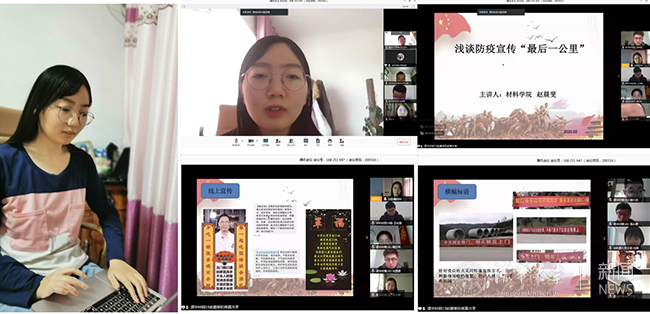 材料学院讲师团通过网络会议开展疫情防控主题教育活动,围绕疫情防控这一特殊时期,确定了阶段性宣讲主题并开展集体备课,提高自身对于疫情防控知识及学校相关政策的理解。2019级材料学院硕士生、校讲师团讲师赵晨斐为材博191等全校10个党支部作了题为“浅谈防疫宣传‘最后一公里’”的抗“疫”主题宣讲。