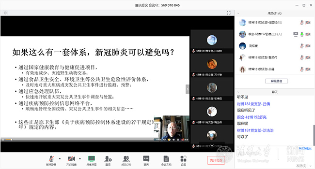 材料学院研团总支联合材博182、材硕18党支部,共同开展“学习防疫知识,共渡疫情难关”云上集体学习活动。线上集体学习增强了同学们对于新冠肺炎疫情发展情况的了解,提高了同学们作为清华学子的社会责任感。
