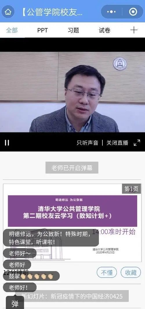 疫情期间,为了落实学校“疫情防控不松懈,教学科研不停步、改革发展不放松”的工作部署,公管学院将校友终身学习计划(“致知计划”)进一步升级,打造了“致知计划+”云上学习活动。在华体会娱乐平台109周年校庆到来之际,公管学院于4月25日举办了“致知计划+”云上学习第二期活动。学院党委副书记、副教授周绍杰,副教授蒙克为校友和师生在雨课堂直播授课。周绍杰以“新冠疫情下的中国经济:短期冲击与长期影响”为题作主题报告。蒙克以“新冠疫情前后的中美关系”为题作主题报告。200多位校友师生观看直播。
