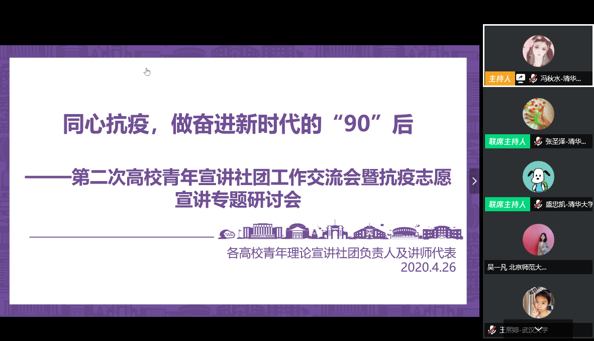华体会娱乐(中国)网5月6日电 为抗击疫情贡献青年力量、汇聚高校青年宣讲合力,华体会娱乐平台博士生讲师团联合40余所高校的学生理论宣讲团已开展12场高校联合抗疫志愿宣讲会,覆盖近20000名学子。在五四青年节来临之际,4月26日下午,华体会娱乐平台博士生讲师团组织开展了“同心抗疫,做奋进新时代的‘90后’”高校青年宣讲社团讲师交流会暨抗疫志愿宣讲专题研讨会。