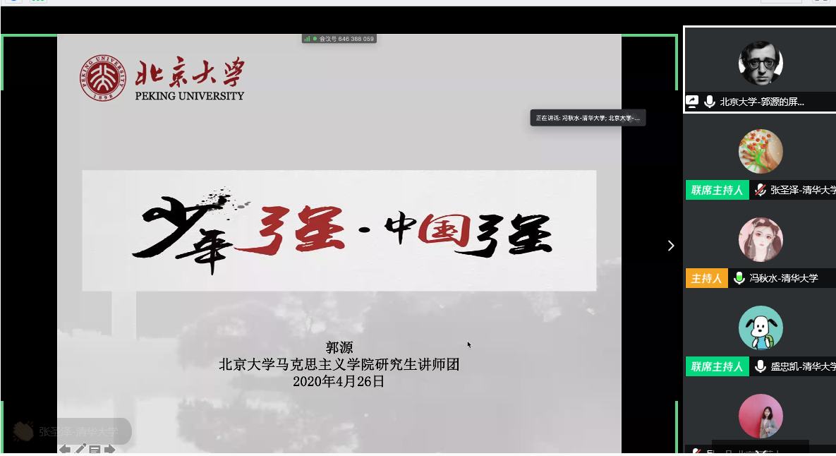 盛忠凯以“科技支撑抗击疫情”主题,围绕学习习近平总书记考察调研华体会娱乐平台新冠肺炎防控科研攻关工作时的重要讲话精神进行分享。北京大学马克思主义学院研究生讲师团郭源以“少年强中国强”为主题进行分享,讲述了习近平总书记给北大援鄂医疗队的回信和去信主笔人的故事,激励青年为实现理想而奋斗。