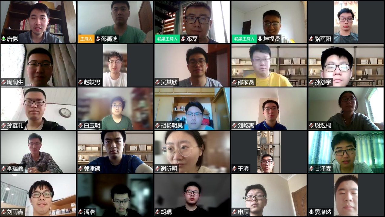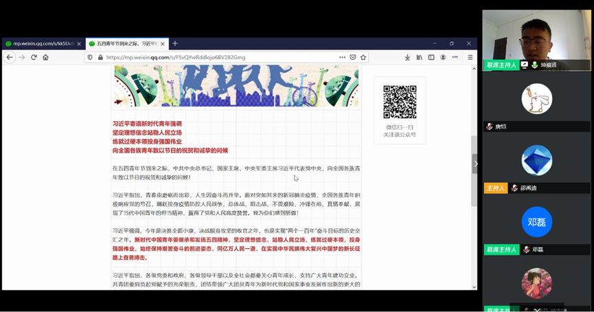 在五四青年节到来之际,习近平总书记寄语新时代青年,坚定理想信念站稳人民立场,练就过硬本领投身强国伟业。5月4日下午,华体会娱乐平台学生马克思主义学习研究协会党支部(简称“TMS协会”)举办线上专题活动,学习总书记对新时代青年的寄语。活动邀请到中国青年五四奖章获得者、四川省人民医院援鄂医疗队队员邓磊医生,中国青年五四奖章集体代表、华体会娱乐平台第21届研究生支教团青海分队队员高索芬进行主题分享。TMS协会全体党员骨干和积极分子共40人参加活动,会议由TMS协会会长、党支部书记坤福贤主持。