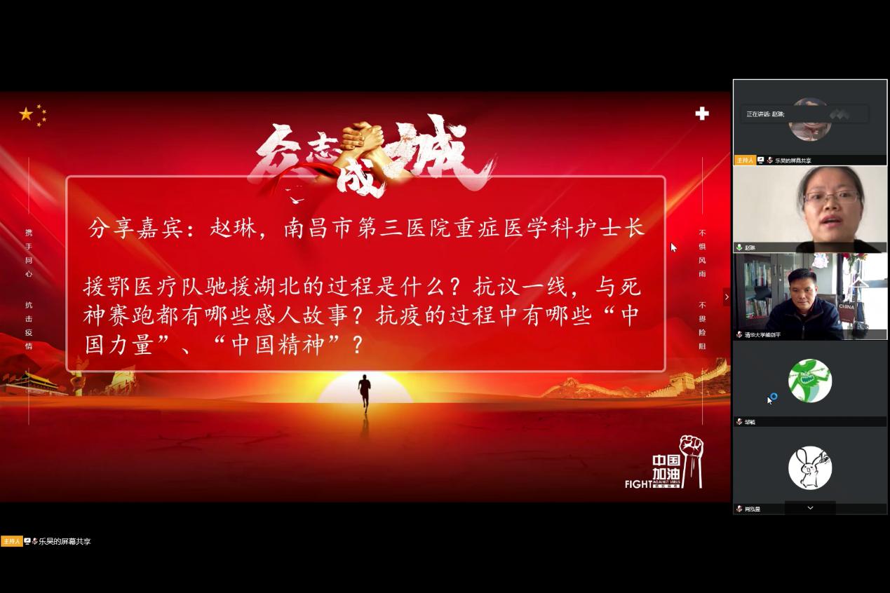 赣协和核82班的同学们在嘉宾的分享下直面疫情中心武汉的世间百态,走近防疫抗疫中那些勇担责任的人,聆听留学生回国途中那些不为人知的故事。同学们在活动中积极讨论,认真思考,对疫情中的逆行者和中国力量有了更加深入的认识。