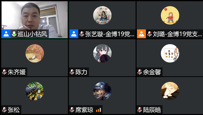 本次会议由金博19党支部宣传委员刘璐主持。各支部书记依次介绍支部情况。金博19非全日制党支部书记张兰波介绍,金博19非全日制党支部由12名在职同学组成,大家在金融业界有丰富的实践经验,疫情期间一边努力开展科研学习,一边在各自岗位上认真履职尽责,积极贡献力量。金博19党支部书记张艺璇介绍,金博19党支部由10名党员及6名积极分子组成,疫情期间同学们在家认真学习的同时,在线上举办了多次相关的组织生活,如“并肩战疫,共克时艰”线上主题研讨会、“风雨同舟、命运与共”党团班共建活动、“天涯比邻,疫路同行”清华-华中大两校四院党支部共建活动等,支部还组织党员自发捐款,为抗击疫情尽绵薄之力。