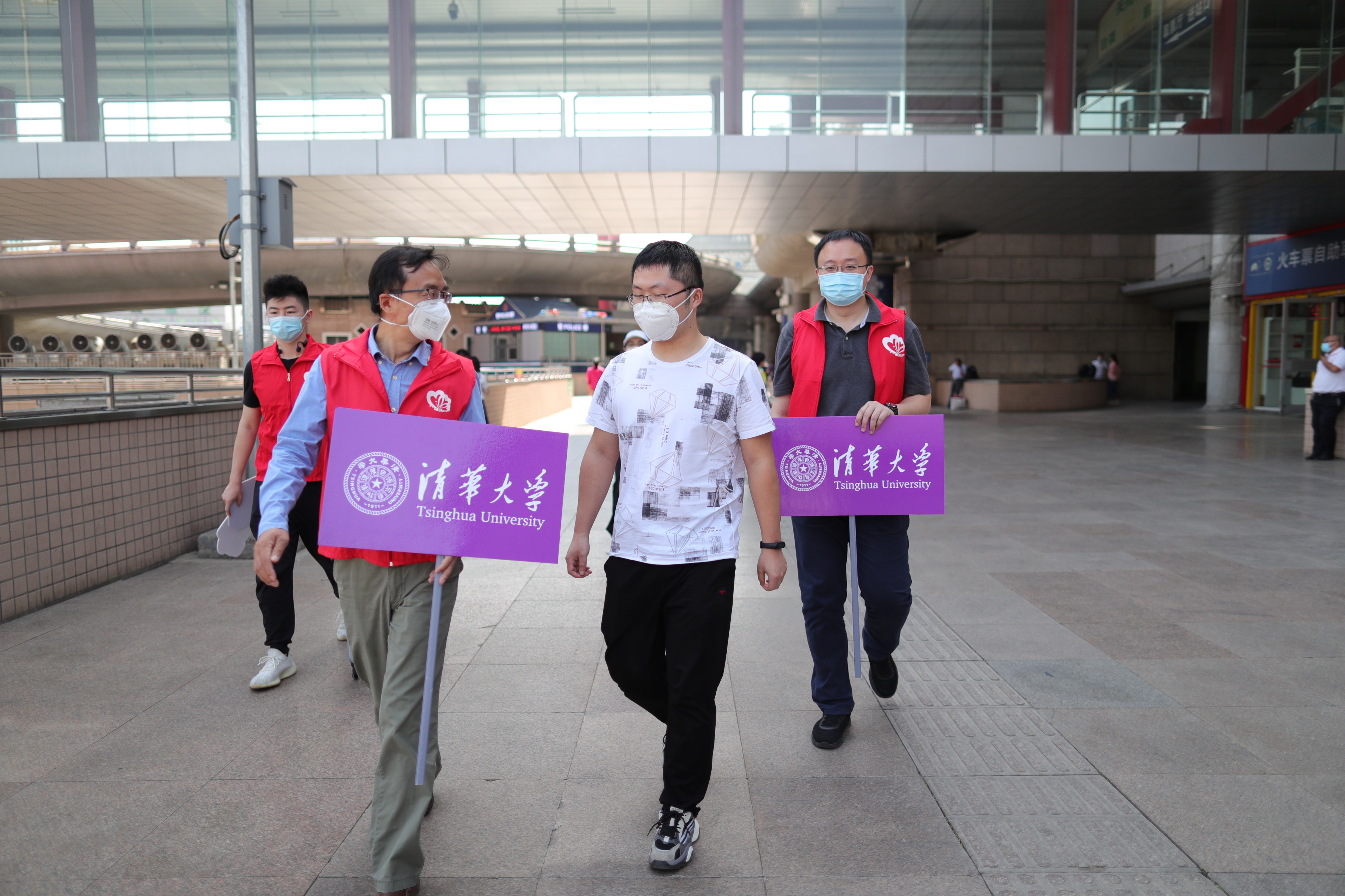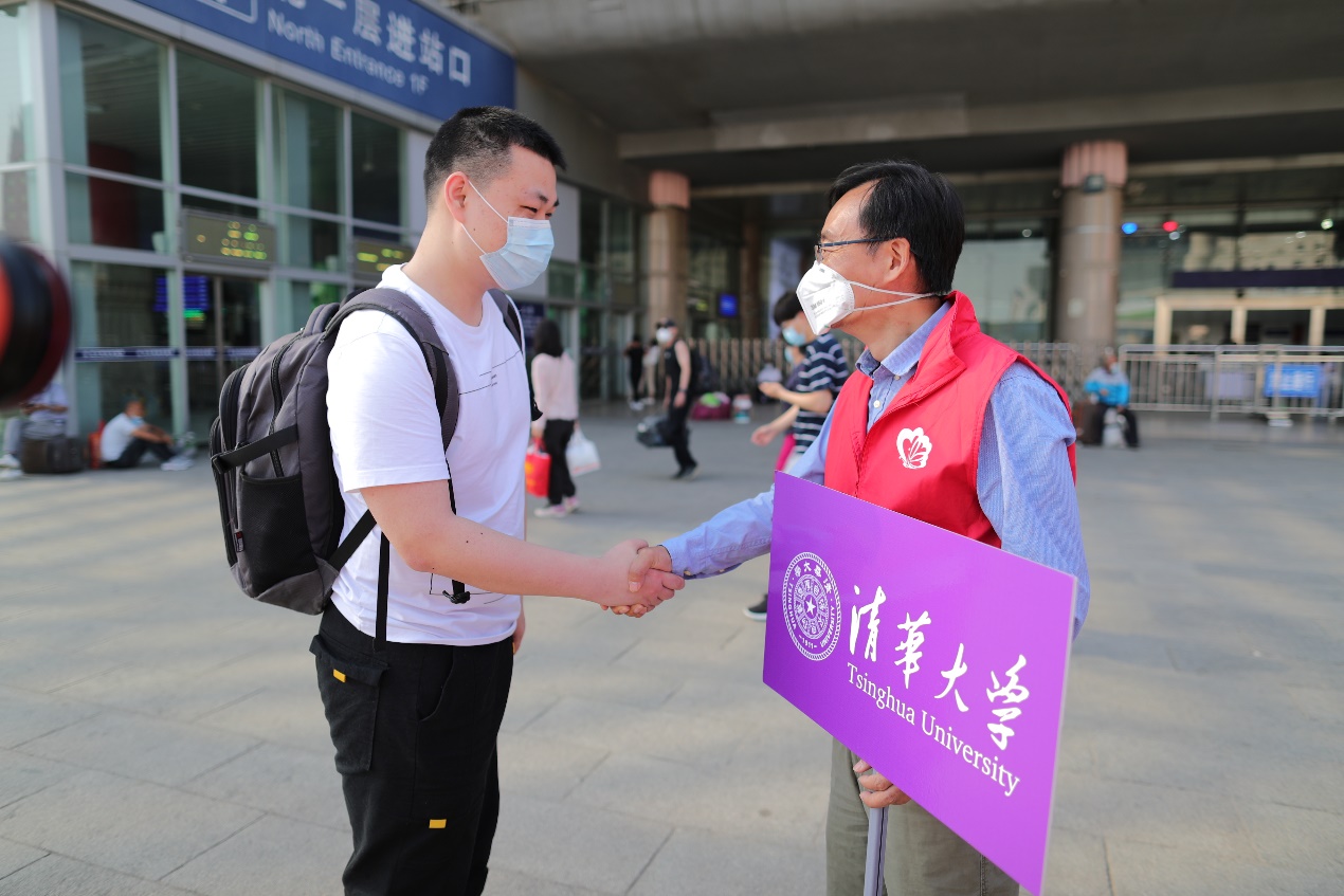 来自湖北的能动系本科生田宇一出站,就朝举着清华紫标牌的志愿者们走来。大家的手紧紧握在一起。“欢迎回家!”