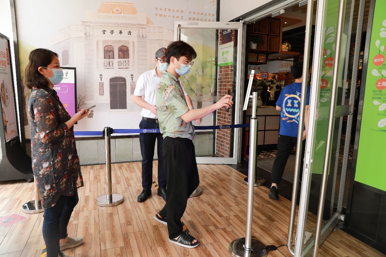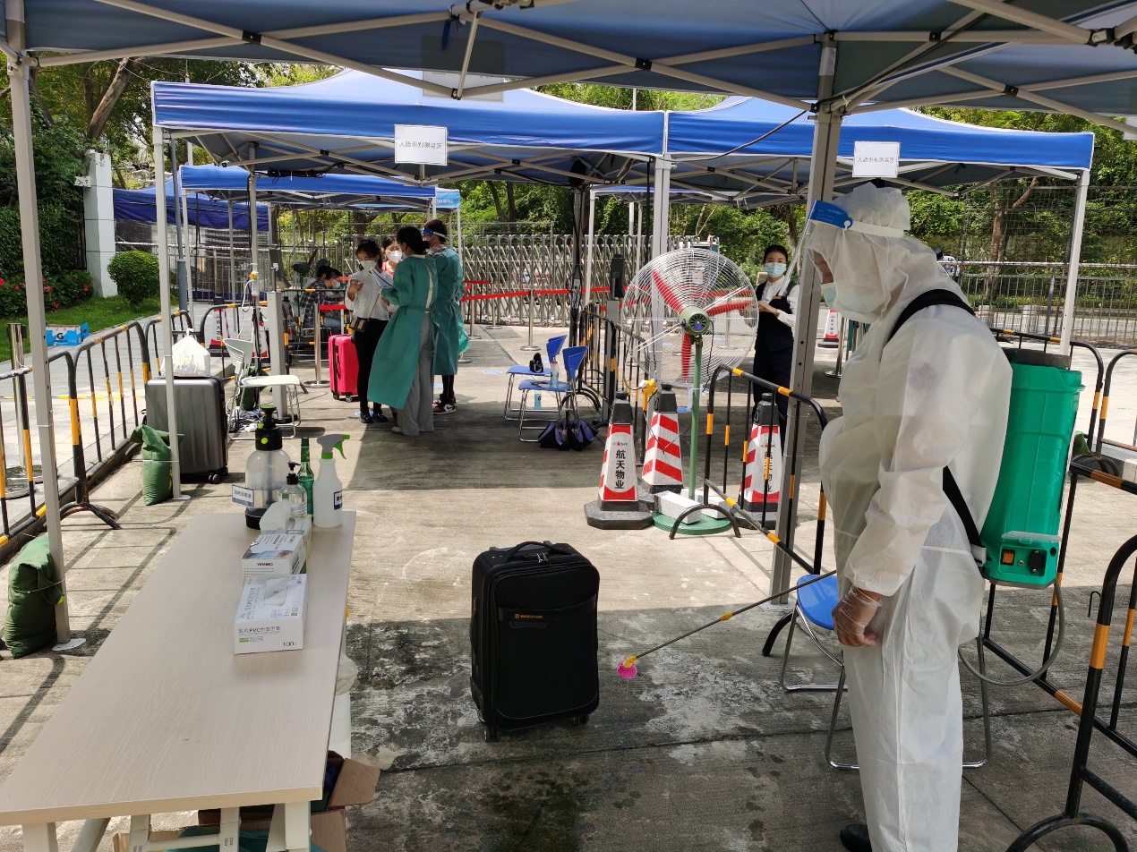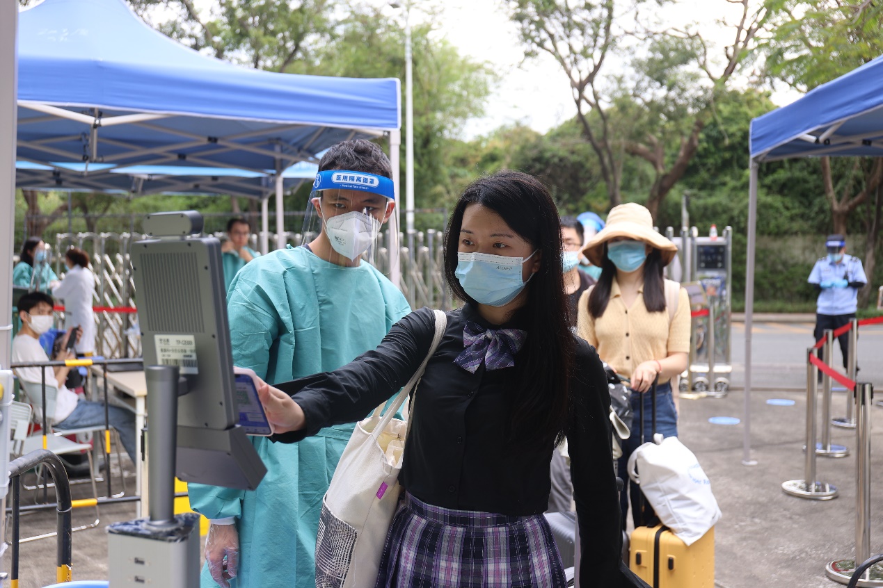 11日当天,校门口设置临时等候区和健康观察区,食堂和校内外学生宿舍门口等地启用了“电子哨兵”,最大程度地保障师生健康安全。学院还推出了“云抗疫”微信小程序,以便师生快速通过“入校申请”“核酸打卡”“班车扫码”以及“核酸提醒”等流程的确认或申报。为防止人员聚集,同时快速精准地核验返校人员的健康和行程情况,学院特设三台智能防疫检测设备,通过入校“白名单”核验的师生方可通过设备检测,一站式完成粤康码、行程卡和24小时(市外返校48小时)的核酸阴性报告或落地检证明的核验。