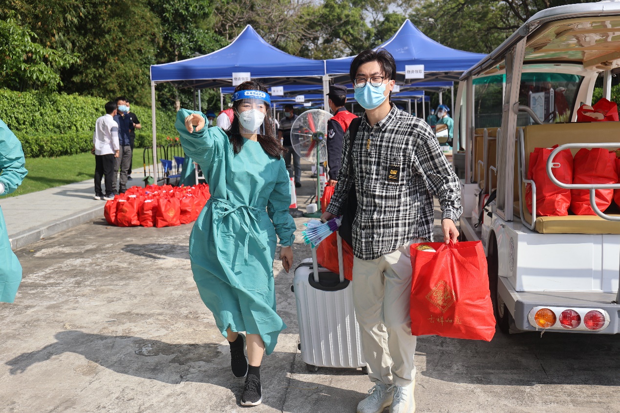 在校门口,防疫工作人员为同学们进行行李消毒,发放防疫物资,并安排摆渡车从校门口“点对点”将大家送往所在宿舍楼。返校的同学们将在宿舍进行三日健康监测,在校内划定区域完成核酸“三天三检”。