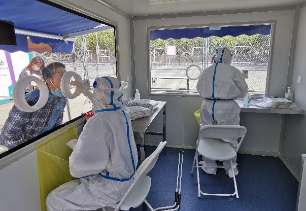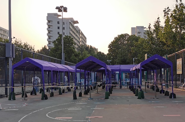 5月下旬,封校伊始,欧阳沁等老师就开始为应对即将到来的高温天气想办法。5月18日深夜,新的采样方舱到位,我们逐个对方舱做了检查,确保灯光和空调都工作正常。第三天,所有方舱就开始启用,医护人员在方舱中采样,顺利地度过了后面几天持续高温的日子。为了让同学们排队检测时能够避免太阳暴晒,欧阳老师和闫老师及时协调安装了遮阳棚,遮阳棚安装上以后,紫荆篮球场半场点位的环境条件得到了极大的改善。后来,为了适应同学们的学习生活习惯,避开中午最热的时段,我们又将检测时间调整到了下午和晚上,这些调整都得到了同学们的积极好评。