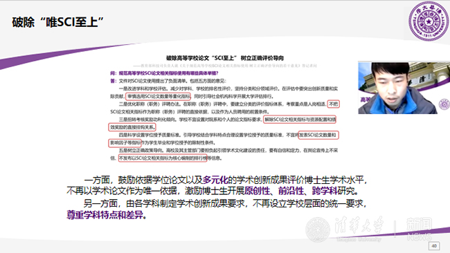 随后,线上采访小组播放了前期采访教务处处长李俊峰教授、航院工程力学系教授冯西桥以及数学系教授白峰杉的视频。就成绩评价体系,白峰杉指出,成绩是量化看教育的产物,从百分制到等级制度是进步,但仍有不足,需进一步改进;李俊峰和冯西桥指出,相比成绩,能力的提升更为重要。三位教授均表示学术诚信很重要,白峰杉更指出诚信是一种习惯,不仅与学术有关,也与将来的生活和工作密切相关。