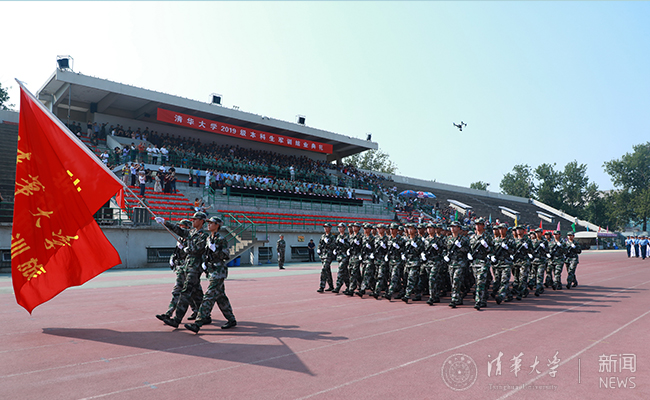 在军旗带领下,在雄壮的《分列式进行曲》的伴奏中,护旗方队、飞行学员班方阵率先登场,随后,学生军训旅所属的32个连组成了16个方队沿着东大操场红色跑道依次正步经过观礼台。整齐的方阵、嘹亮的口号、刚劲的摆臂、有力的踢腿,举手投足间,既透出军人坚毅果敢的气质,又彰显着新一代清华学子热情昂扬的精神风貌,赢得了观礼台上各位领导和嘉宾、师生的阵阵掌声。