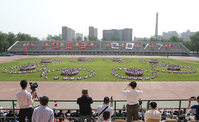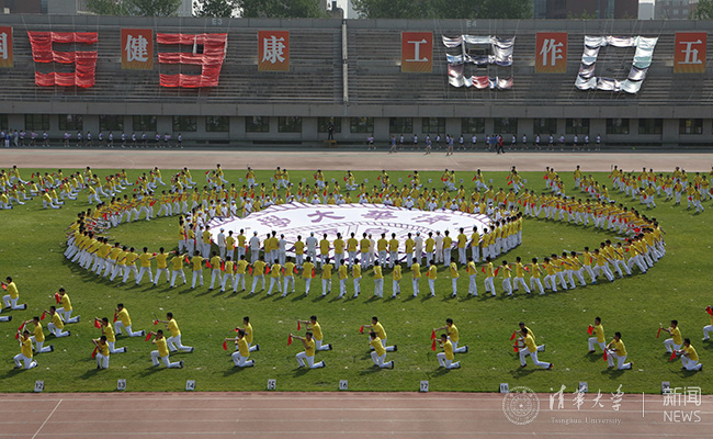 384名手持花球的女生首先上场,带来了热情四射的啦啦操表演。同样由384名大一男生表演的刀术展示了清华力量、宣扬了清华精神,整齐划一的动作展示了刻苦训练的成果,嘹亮高昂的口号喊出了拼搏向上的精神。两场团体操的表演同时,健美操专项课的女生和清华附中及清华附小的同学们也带来了精彩表演。