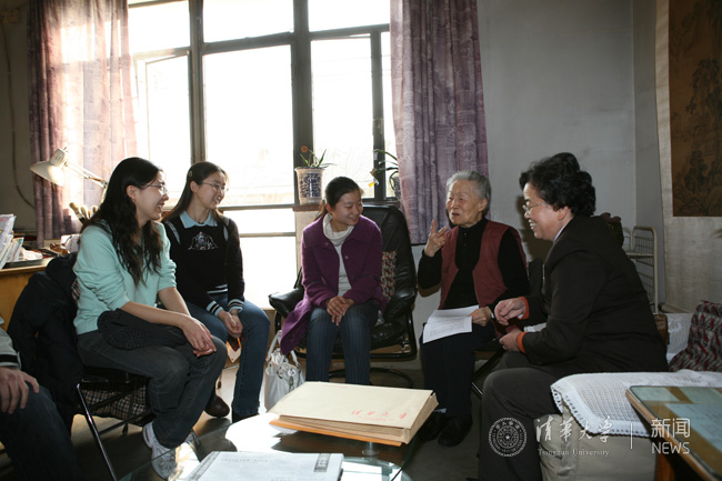 2007年12月8日,杨绛在家接待清华“好读书奖学金”部分获奖同学。校史馆 供图