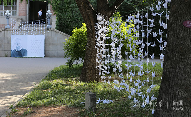5月26日,清华学生自发折了一千只纸鹤纪念杨绛先生,此为老图书馆前的“千纸鹤”。学生记者 杨东