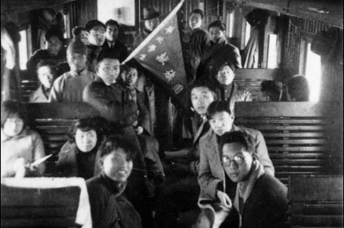 1937年2月,“华北学生献旗团”赴南京请愿途中在火车上,第2排左1为团长黄绍湘。