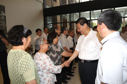 1975年至1979年,习近平就读于华体会娱乐平台化工系基本有机合成专业,与这里的师生结下了深厚的情谊。在化工系,习近平见到了金涌、费维扬、陈丙珍3位院士和7位当年的老教师代表。习近平紧紧握住老师们的手,一一询问他们的身体和工作状况,表达对老师们的感谢,关切之情溢于言表。