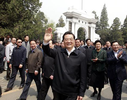 4月的清华园,风和日丽,紫荆盛开。上午9时30分,当胡锦涛总书记来到清华园时,受到了清华师生的热烈欢迎。