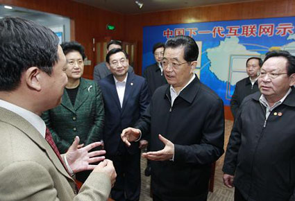 图为胡锦涛在信息网络工程研究中心详细询问两代互联网衔接、下一代互联网技术标准和安全性能等情况。新华社记者鞠鹏摄