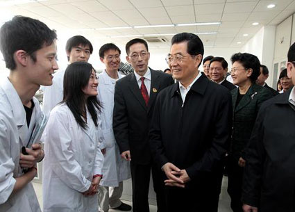 在结构生物学中心,胡锦涛听取了生命科学院院长、中心主任施一公关于教师队伍、体制改革、学生培养等方面的情况汇报,与在场的青年教师亲切交流。正在实验室工作的“夫妻研究拍档”——助理研究员王丰、博士后梅子青向胡锦涛介绍了他们刚刚在国际著名学术刊物《自然》发表的有关原核细胞蛋白降解小体调节亚基的晶体结构解析的论文,以及正在研究与老年痴呆症密切相关的分子结构时,胡锦涛勉励他们继续努力工作。他还饶有兴致地带上三维眼镜,观看由博士生解析出来的蛋白质经衍射后生成的三维电子密度图。总书记深有感触地说:“看了你们这个中心,有两点印象尤为深刻。一是生命科学作为二十一世纪的核心学科,对于经济社会发展和人民身体健康关系重大。二是领军人才在学科发展中起着关键性作用。”他鼓励大家百尺竿头、更进一步,在结构生物学领域取得突破性成果,努力使我国的生命科学研究走到世界前列。