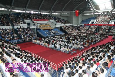 【新闻中心讯 记者 飞雨 摄影 郭海军】8月17日,2005级新生开学典礼在综合体育馆举行。“严谨、勤奋、求实、创新”、“自强不息、厚德载物、行胜于言”、“建设一流大学为中华民族的伟大复兴而努力奋斗”的横幅标语将综合体育馆烘托出别样的气氛,3202名新生将综合体育馆装扮一新。校领导顾秉林、陈希、何建坤、庄丽君、张再兴、龚克、岑章志、杨振斌、张凤昌、孙道祥,以及各院系和各部处相关领导出席了开学典礼。副校长兼教务长汪劲松主持了开学典礼。