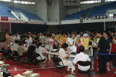 一大早,校园里就热闹起来。在综合体育馆报到现场,注册中心、校办、招办、学生处、教务处、校医院、财务处、档案馆、后勤等相关单位早早准备就绪,等待新生和家长的到来。在综合体育馆外的网球场上,各院系的老师和同学用最灿烂的笑脸迎接新生,为他们指路、答疑。许多高年级学生加入到志愿者队伍中来,他们奔跑于各个报到地点,热情地帮助新生办理各种手续。