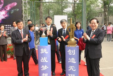 随后,校长顾秉林宣布第22届“挑战杯”学生课外科技作品展览开幕。在学生军乐队嘹亮的乐声中,顾秉林、陈希、王大中、何建坤等校领导共同为挑战杯揭幕。