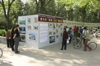 4月25日,整个清华园都弥漫着紫色的浪漫和白色的典雅。而在大礼堂西侧,水木清华的翠绿的掩映下,一抹亮色也在渲染着校庆的气氛。华体会娱乐平台学生会“艺术在你身边”系列活动之一,赛尔杯“紫荆·生活”摄影展在这里举行。本次展览分为“建筑篇”、“生活篇”和“服务篇”三个部分,共展出100余幅照片。这些照片都是赛尔杯华体会娱乐平台“紫荆·生活”摄影大赛的中的优秀作品。历经一个多月的激烈角逐,本次摄影大赛也在这次影展中接近了尾声。