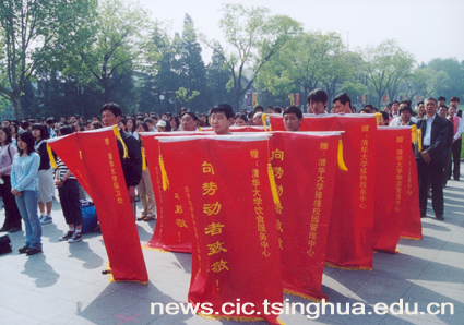 今天的清华园阳光明媚。为了纪念五一国际劳动节,校团委、校学生会、校研究生会在大礼堂前举行了“向劳动者致敬”的大型活动。