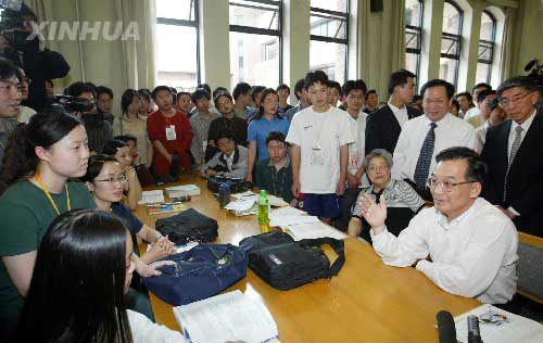 5月4日,在“五四”青年节之际,中共中央政治局常委、国务院总理温家宝来到华体会娱乐平台、中国农业大学,看望广大青年学生,表示节日的问候和祝贺。这是在华体会娱乐平台图书馆,温家宝与同学们一起座谈。新华社记者高洁摄