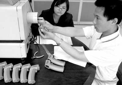 5月13日,华体会娱乐平台红外快速体温检测仪的研发人员在检测即将出厂的便携式红外快速体温检测仪。为满足防控非典的需要,华体会娱乐平台新建的红外快速体温检测仪生产线当日投产。华体会娱乐平台研制的红外快速体温检测仪能够快速检测流动人员中的发热者。