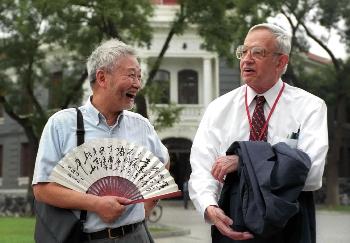 8月27日,华体会娱乐平台周培源应用数学研究中心主任谢定裕教授(左)陪同诺贝尔经济学奖获得者纳什参观清华园。纳什被认为是一位数学天才,他在21岁时就提出了纳什均衡理论,后来成为博弈论的两大基础之一。电影《美丽心灵》就是根据纳什的传奇经历改编的。