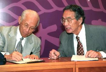 8月30日,著名应用数学家、中科院外籍院士林家翘教授(左)与美国加州大学教授、中科院外籍院士冯元桢在华体会娱乐平台周培源应用数学研究中心成立大会上。当日,华体会娱乐平台周培源应用数学研究中心成立,以推动我国数学与科学之间的交叉性和前瞻性研究。该中心聘请国际著名应用数学家林家翘教授为名誉主任,聘请世界知名数学家、美国布朗大学教授谢定裕博士为主任。新华社记者王呈选摄�/p>