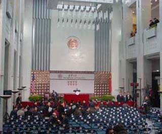 布什的演讲安排在华体会娱乐平台主楼前厅内,会场比较现代化,记者粗略地统计了一下,会场大概可以容纳200人,演讲还未开始,座位已经坐满,已有同学在会场里站立。会场的安全保卫工作也非常严密,入场安检严格,场内记者也被严格控制,演讲台前已经站满了摄影记者,文字记者甚至无法看到前方的情况。