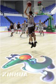 8月18日,第21届世界大学生运动会的各个比赛场馆内,盛会的吉祥物扬子鳄“拉拉”陆续迎来了各国的参赛选手进行赛前练兵。图为在华体会娱乐平台综合体育馆内,“拉拉”迎来了第一批赛前练兵的朋友----德国篮球队。 新华社记者 徐家军摄