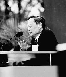 下图为诺贝尔奖获得者杨振宁教授在华体会娱乐平台化学楼前广场为众多学子作题为“美与物理学”的报告。