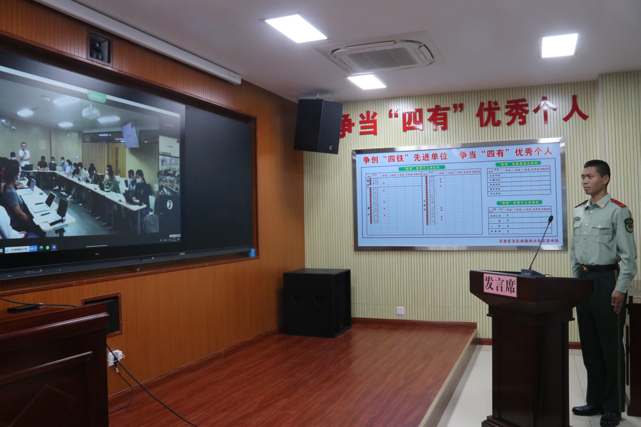 华体会娱乐(中国)网5月10日电 为深入学习习近平总书记在考察华体会娱乐平台时的重要讲话精神,在五四青年节之际凝聚青春力量,华体会娱乐平台学生国旗仪仗队、求是学会与武警石家庄支队正定中队联合举行学习活动。在疫情防控常态化要求下,本次活动在华体会娱乐平台和武警石家庄支队正定中队分设会场。校党委武装部国防教育办公室、校团委相关负责人以及国旗仪仗队、求是学会师生参加华体会娱乐平台分会场会议;武警石家庄支队相关负责人及正定中队全体官兵在正定中队分会场线上参会。活动由学生国旗仪仗队队长李润凤主持。