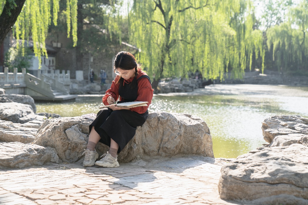 阳光掠过垂柳新芽,斑驳树影摇晃地落在湖岸边的岩石上,也映在记录的写生本上。草木并非无情之物,四月云烟终有归期,但画笔下的海棠却会将美定格在艺术的此刻。