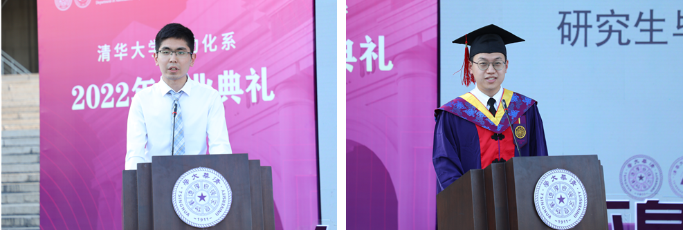 本科毕业生代表、自82班薛传奕发言。他谈到,自动化系“软硬兼施、强弱并举”的学习理念深入本科知识方方面面,自动化系在体育、社工、科创等方面的精彩活动极大地充实了本科生活,“马杯精神,代代相传,自动化系,永远力争”成为自动化系学子们独有的名片。研究生毕业生代表、自博171班乔畅表示,要秉持好奇与探索之心、坚韧与拼搏之心、求真与报国之心,扛起科技兴国的责任与担当,在广阔大地上书写无愧于时代、无愧于祖国的华彩篇章。