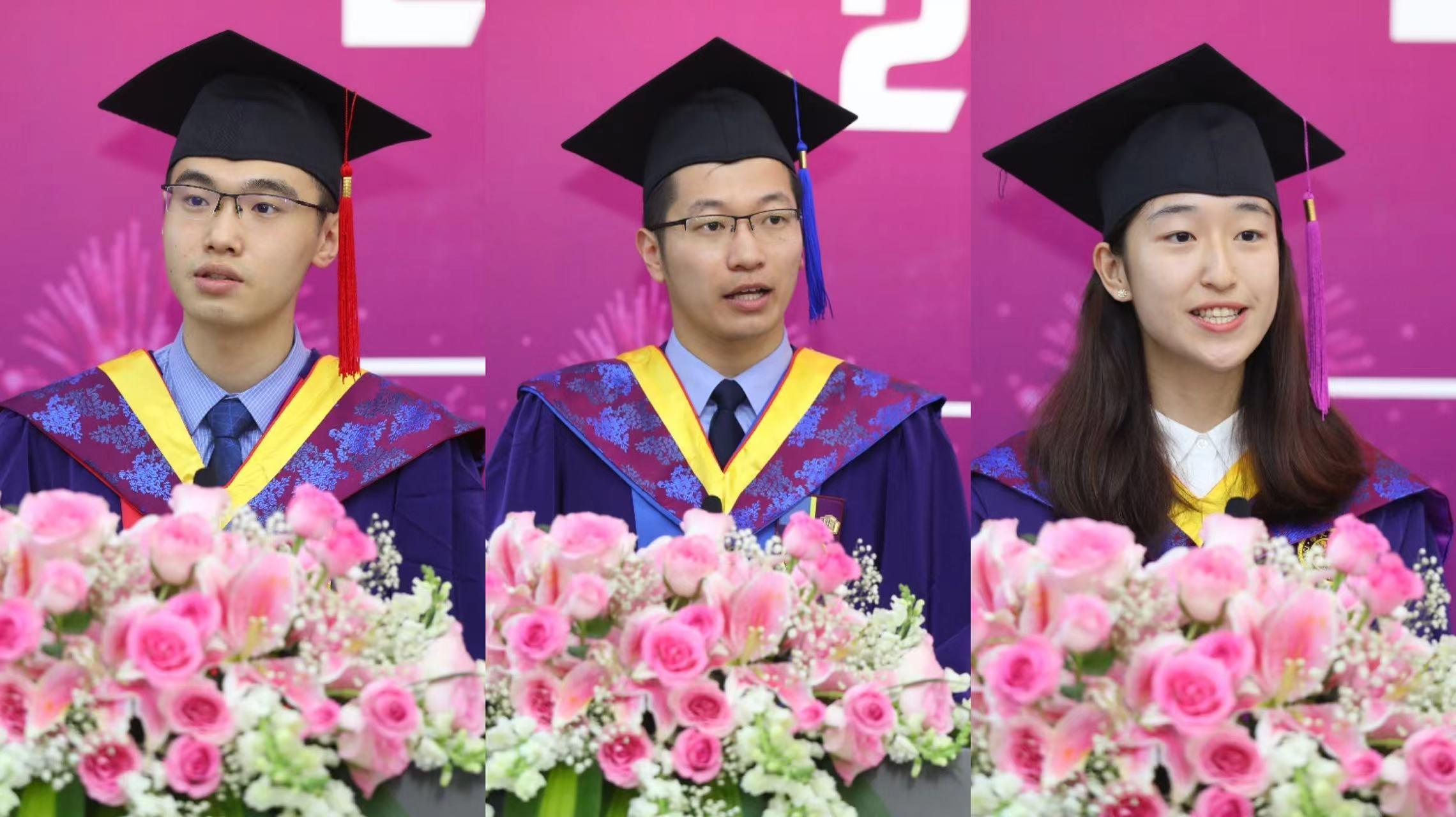 博士毕业生代表卓振宇,硕士毕业生代表王大为,本科毕业生代表王奕三位同学分别作为毕业生代表发言。卓振宇与大家分享了读博期间科研上从初入未知领域的困顿迷茫、沮丧不甘,以及经过反复磨砺、不断沉淀,到最后自己的工作成果被国际同行认可的欢欣鼓舞。他说,是“自强不息,厚德载物”的校训让他在充满不确定性的纷乱环境中一往无前。王大为从价值塑造、能力培养、知识传授三个方面讲述了电机系带给自己的宝贵财富。王奕回忆起自己在四年间的成长与磨砺,感谢清华电机系的培养与支持,让自己从懵懂稚嫩逐渐成长得更加坚韧成熟,学会了在不断开拓的视野中体悟人生的意义与方向。