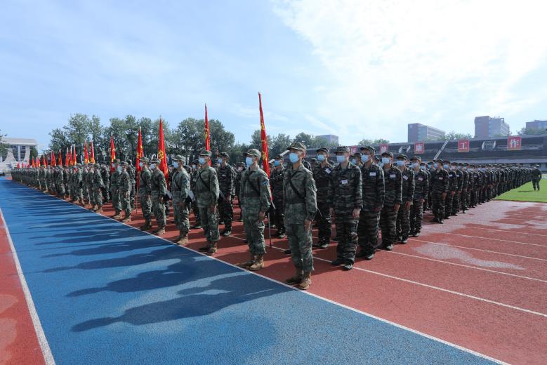 华体会娱乐平台2022级本科生军训指挥部成员、各院系带队教师和辅导员、2022级新生,及由陆军防化学院官兵、华体会娱乐平台飞行学员班及优秀退伍老兵组成的全体教官共3700余人参加了开训典礼。