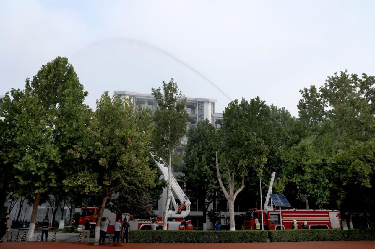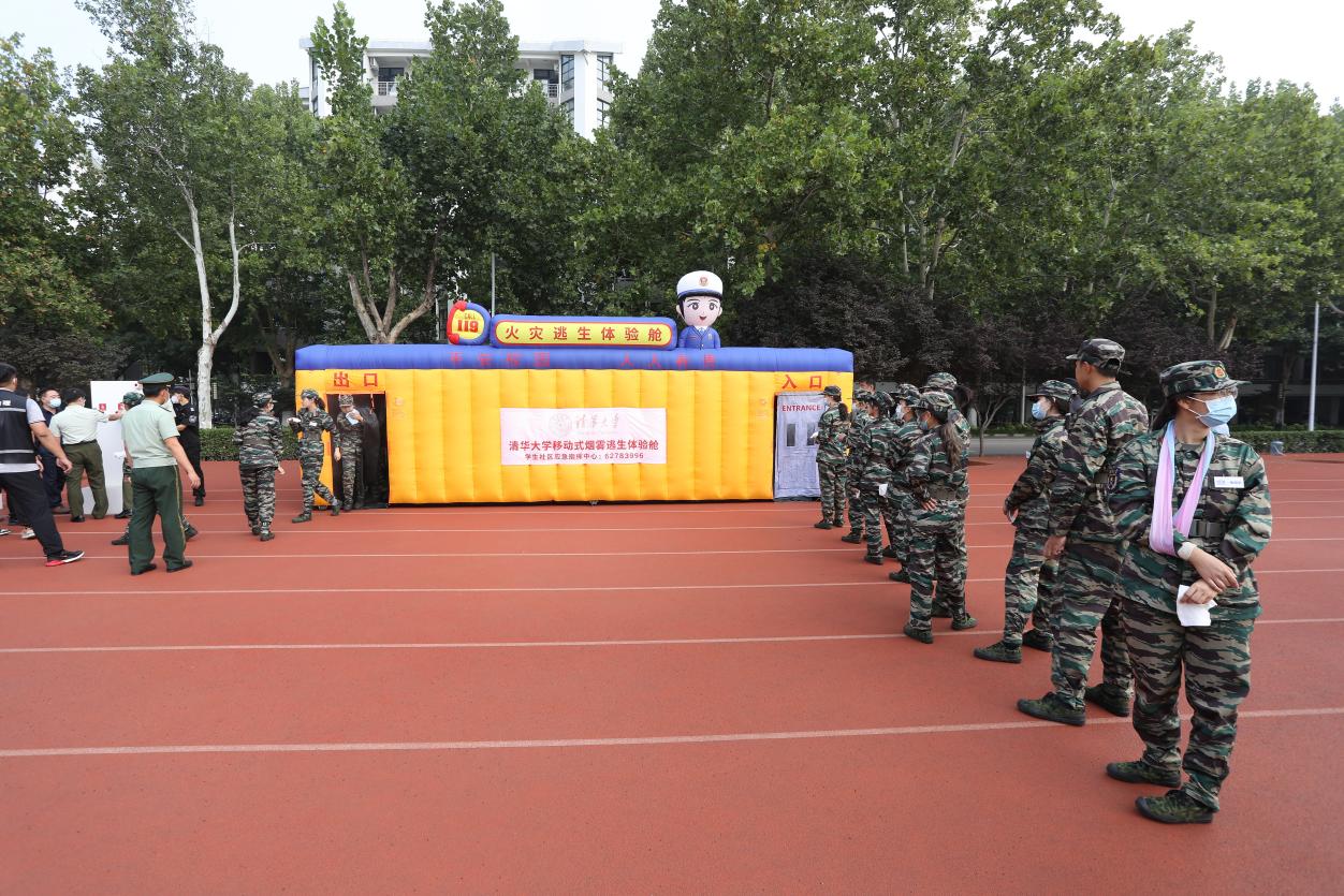 当天上午的本科生新生消防演习中,模拟了紫荆8号楼某宿舍中厅“学生使用违章电器引燃厅内物品”的火情。学生社区公共安全应急指挥中心接到报警信号后,迅速启动火灾应急处置预案,远程打开楼宇应急疏散门,并开启应急广播加强人员疏散提醒和引导。学生社区中心的微型消防站、工程维修等工作人员抵达现场开展火情控制。海淀消防救援支队派出消防车和高空救援车赶赴现场并开展了高空救人、滑绳自救等科目的展示。