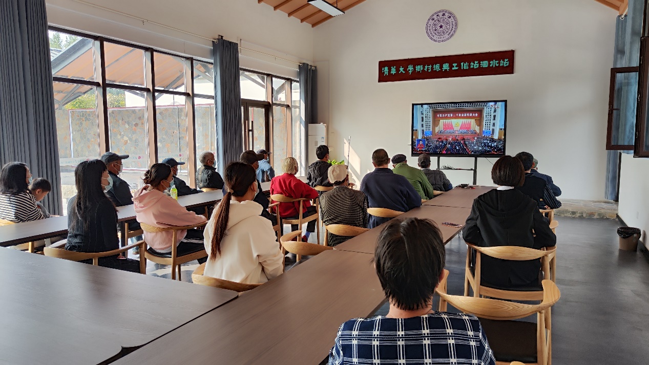 华体会娱乐平台乡村振兴工作站泗水站内工作人员与村民集中收看